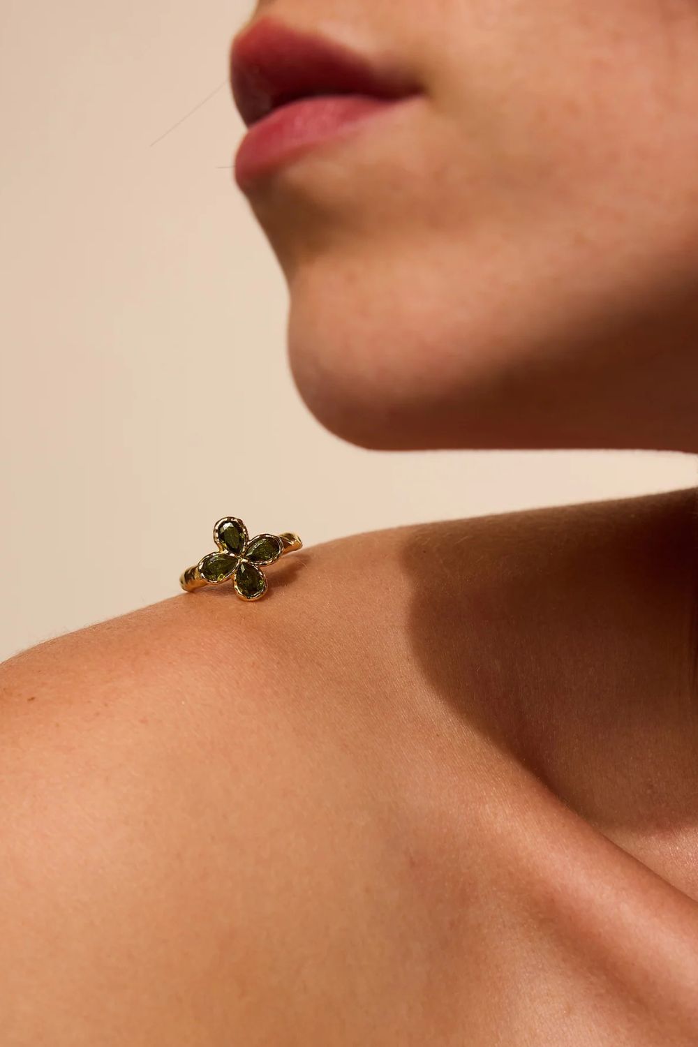 A four-leaf clover ring hand-set in gold, with a textured band and an irregular finish. Each leaf is formed by a deep green, pear-cut stone.