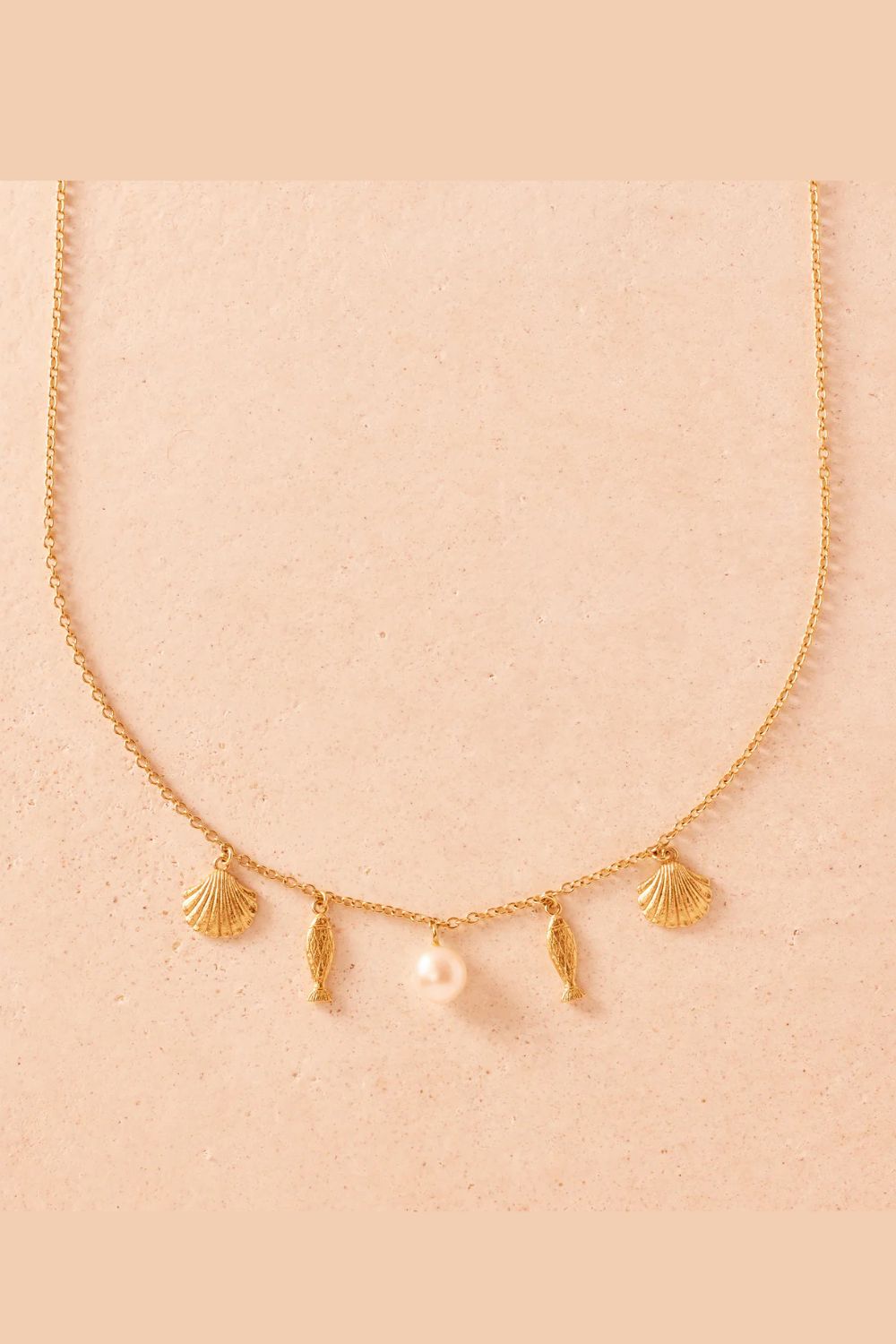 The ultimate summer necklace. Seashells, fishes and a pearly centerpiece harmoniously arranged to capture the spirit of the sea. Wear it to feel the connection to nature and the joy of summertime gatherings.
