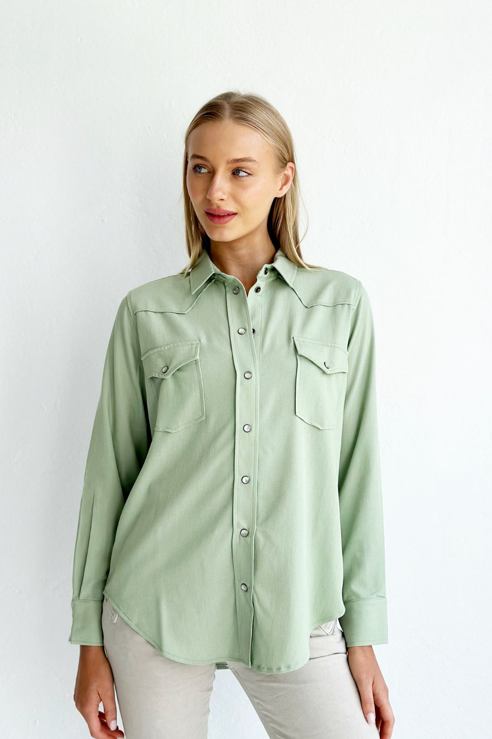 The Lady Rancher has a distinctly Western feel, feature pockets, curved yoke, finished with gold trimmed pearl buttons. A feminine silhouette cut from our super soft Tencel.