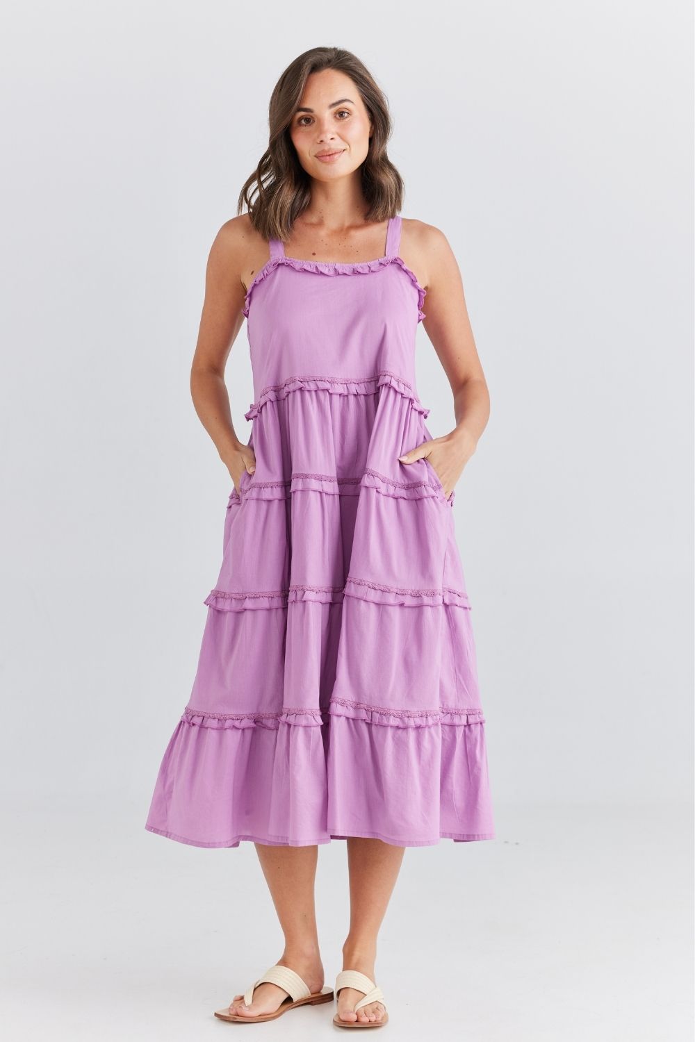 Midi dress with adjustable straps, elasticated back neck, tiered skirt with frills