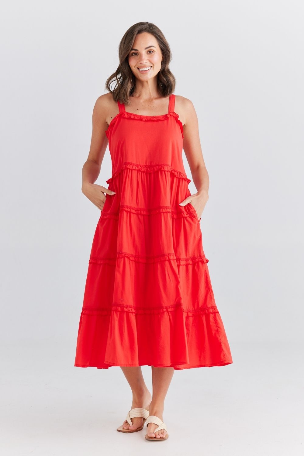 Midi dress with adjustable straps, elasticated back neck, tiered skirt with frills