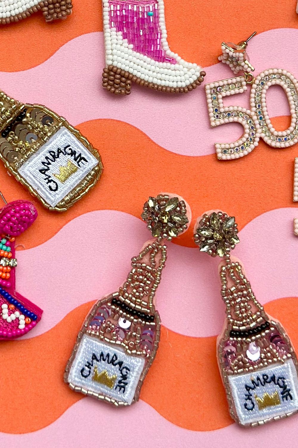 Celebrate in style with these stunning champagne bottle earrings in rose gold. Handcrafted with intricate beadwork and sequins, these earrings feature a playful, sparkling champagne bottle design with a crown detail and the word "Champagne" embroidered at the front. Perfect for parties or special occasions, these statement earrings add a pop of fun to any outfit.