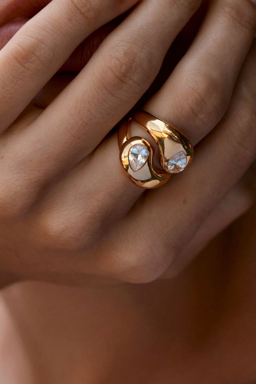 The Blossom Ring boasts a fluid double band and cubic zirconia crystals in a polished gold finish. Handcrafted in Italy.