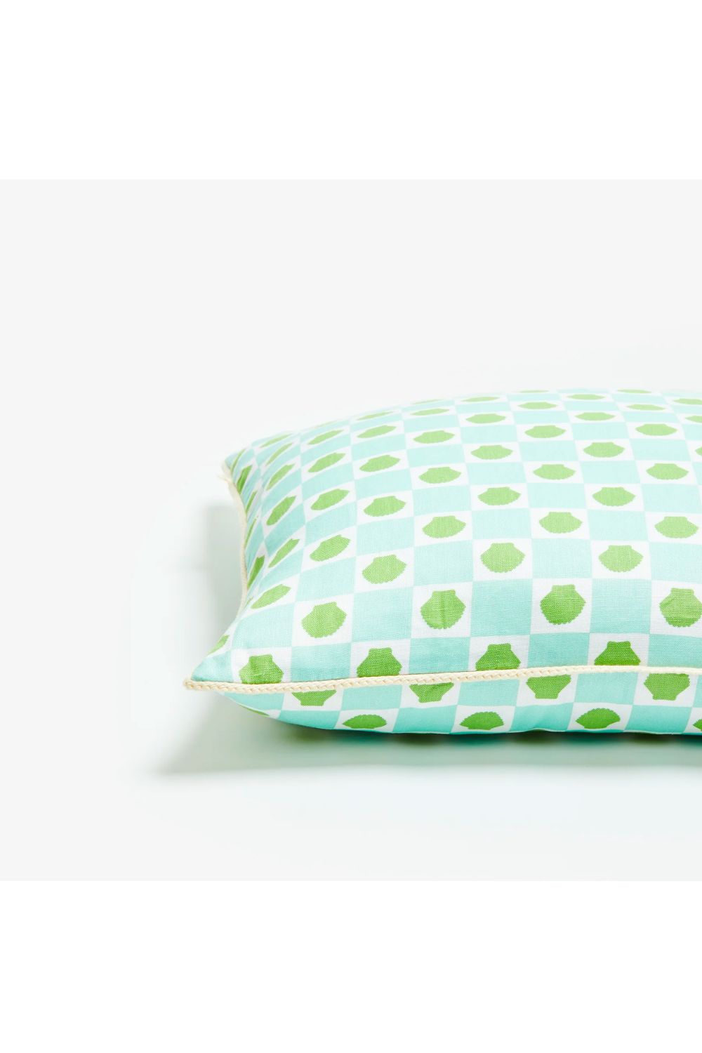 The Shell Check Green Multi 60cm cushion features original artwork by Bonnie printed on oat linen. The reverse of the cushion features the same design.