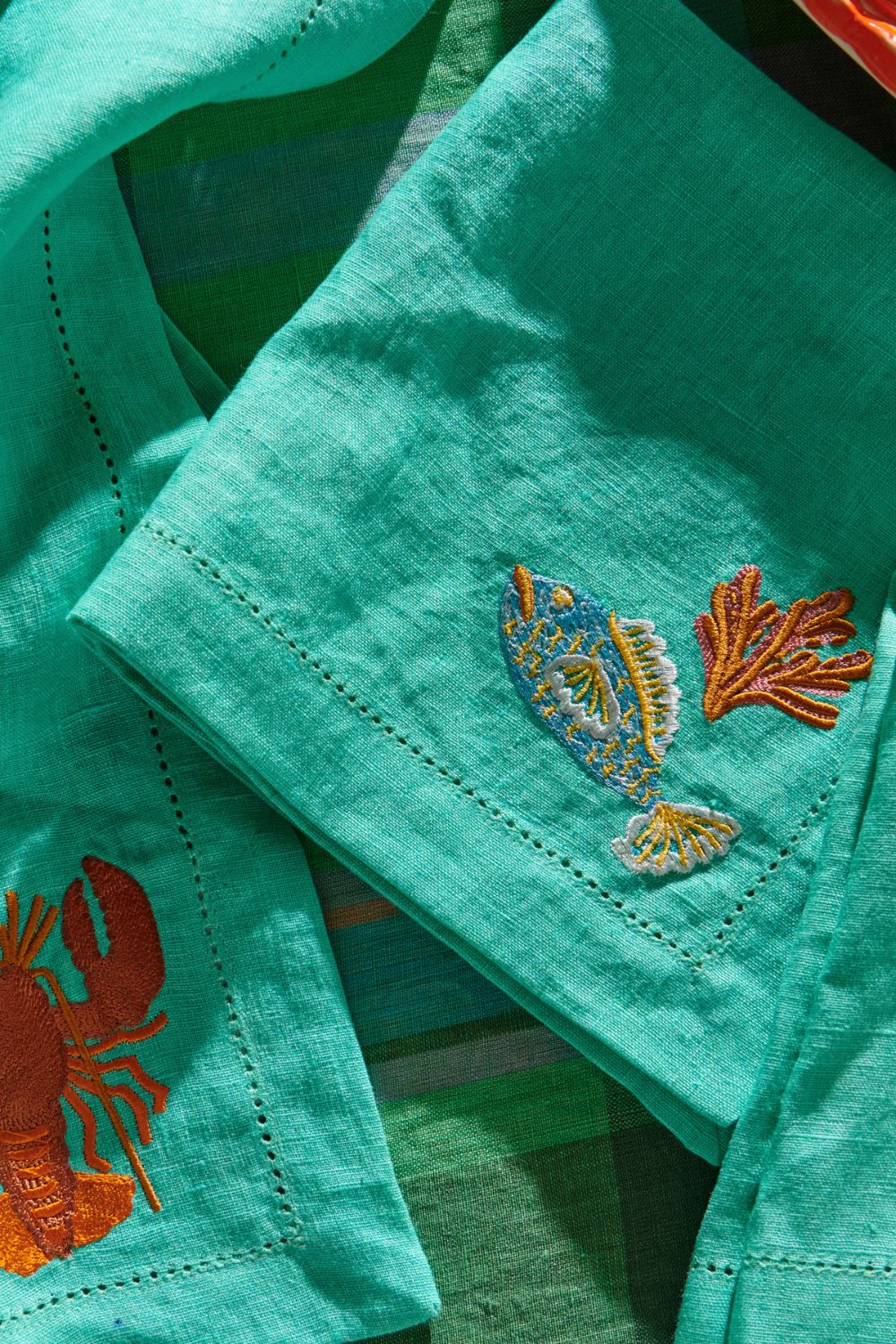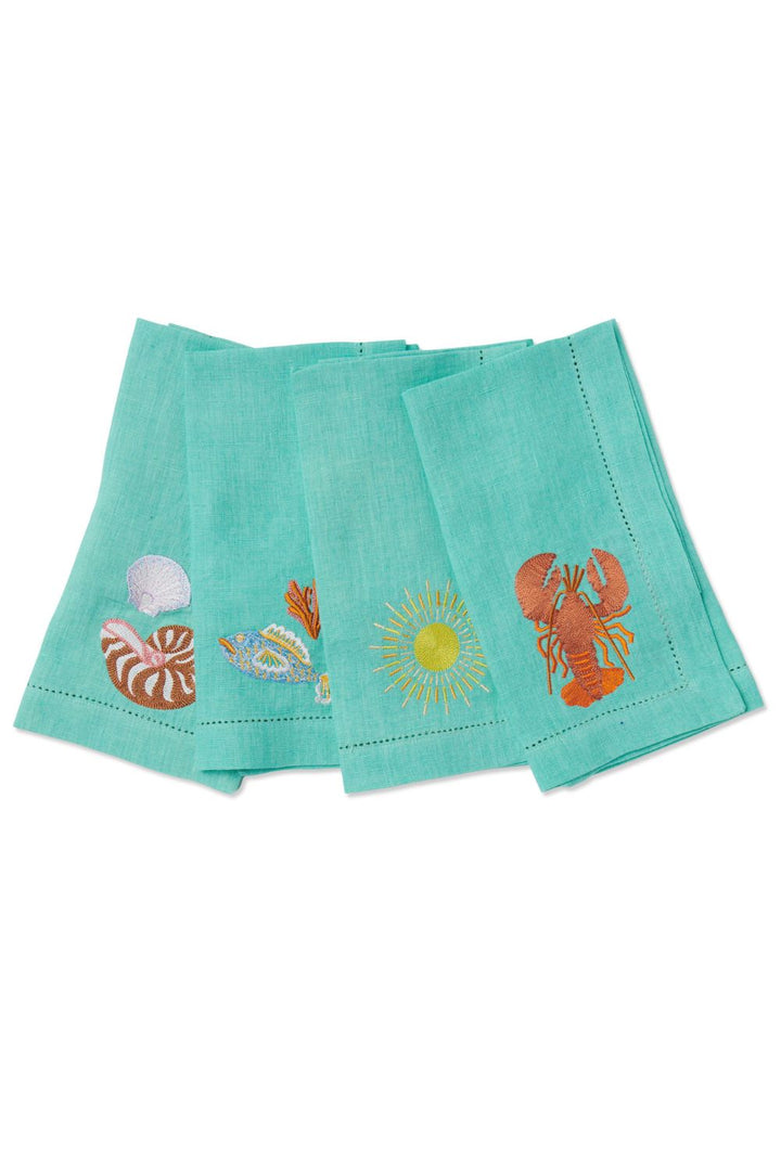 Make a statement with your table decor. Our linen napkins aren't just for tidying up; they're playful accents that spark conversations and set the mood for delightful dining moments. Made from 100% French flax linen the Capri Embroidered Linen 4P Napkin Set is simple and summery, featuring embroidered lobster, a shining sun, shells and a fish on a plain aqua linen. Style with our much loved cutlery for a truly colourful dining experience.