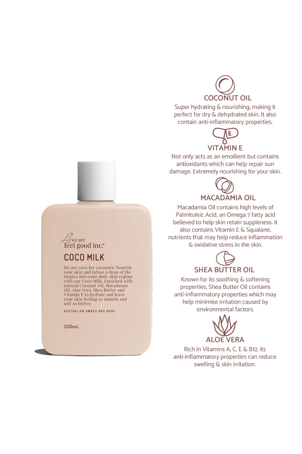 Nourish your skin and infuse a drop of the tropics into your daily skin regime with this coconut moisturiser. Our luxe, face and body Coco Milk hydrates and moisturises skin and is suitable for most skin types. Enriched with natural Coconut Oil, Macadamia Oil, Aloe Vera, Shea Butter and Vitamin E to leave your skin feeling nourished and non-greasy. Use daily for soft, silky skin that smells delicious!