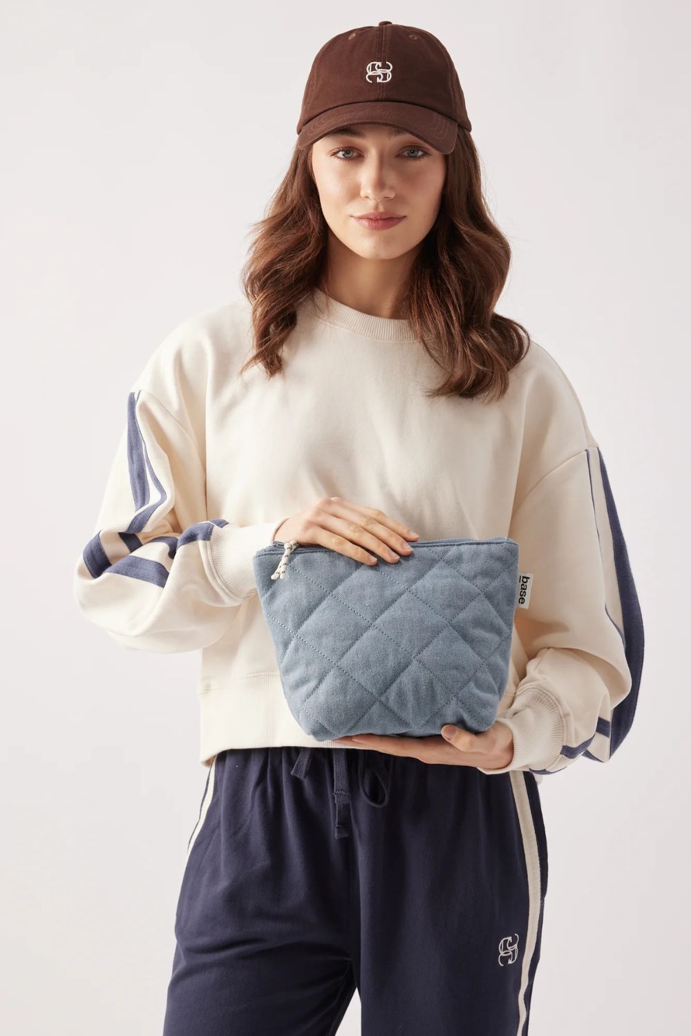 Your stylish grab-and-go pouch for makeup, tech, and everyday extras. It blends timeless style with everyday function featuring premium washed denim quilted fabric for a modern refresh, ready for anything from the bathroom shelf to a weekend getaway.