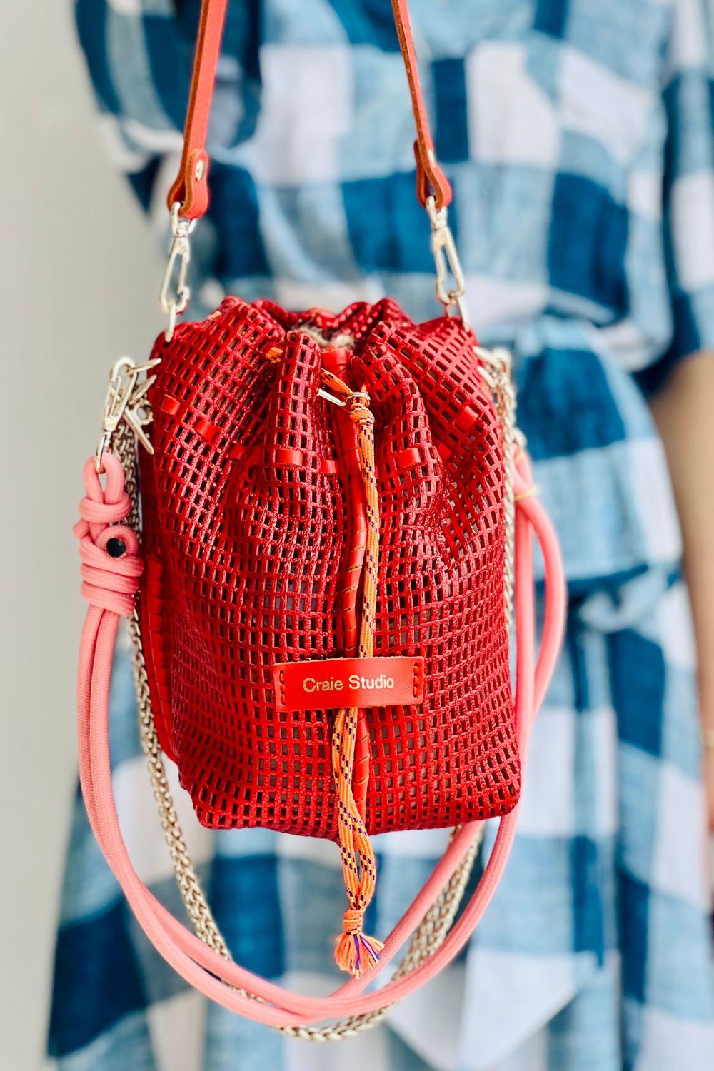 • A standout metallic bucket bag with intricate perforation for a unique, contemporary vibe.