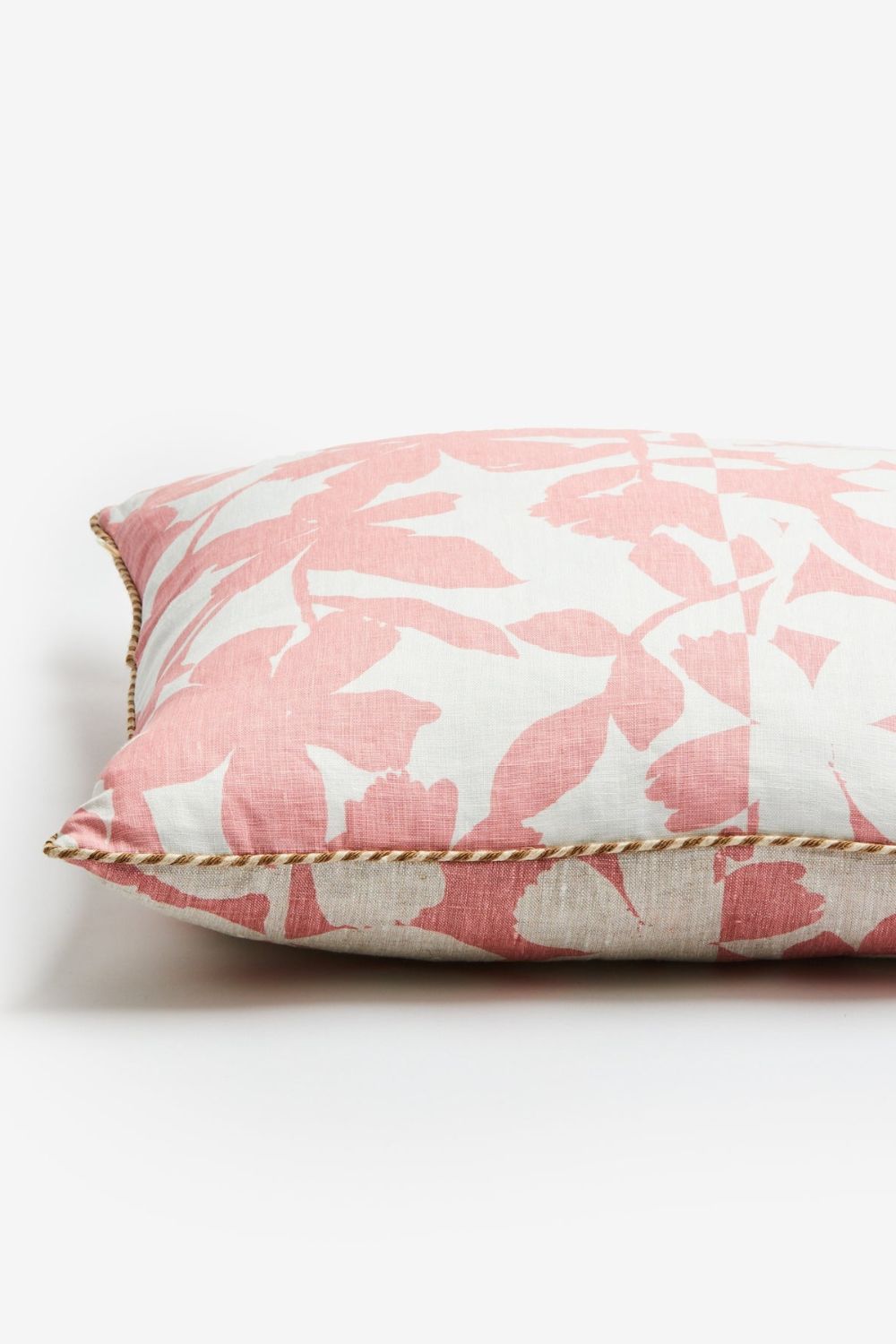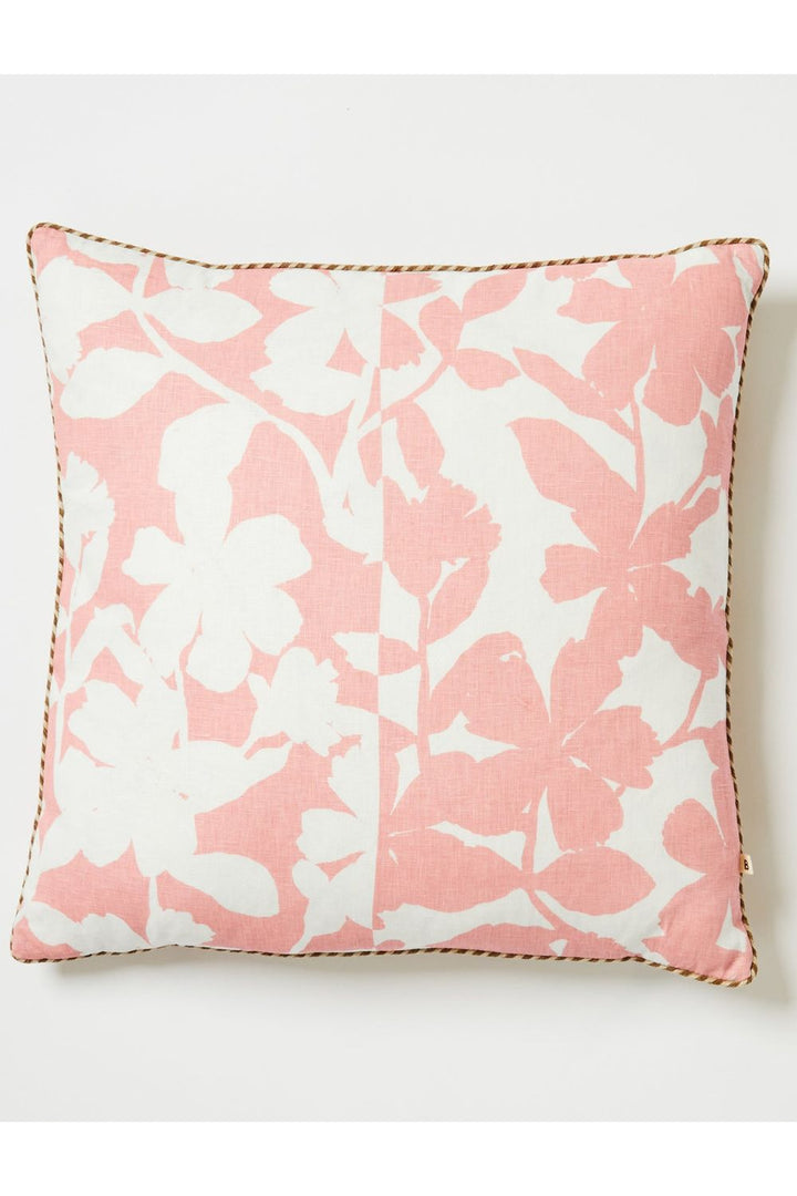 Our Geranium Pink 60cm cushion features original artwork by Bonnie printed on white linen. The reverse of the cushion features the same design in oat linen.