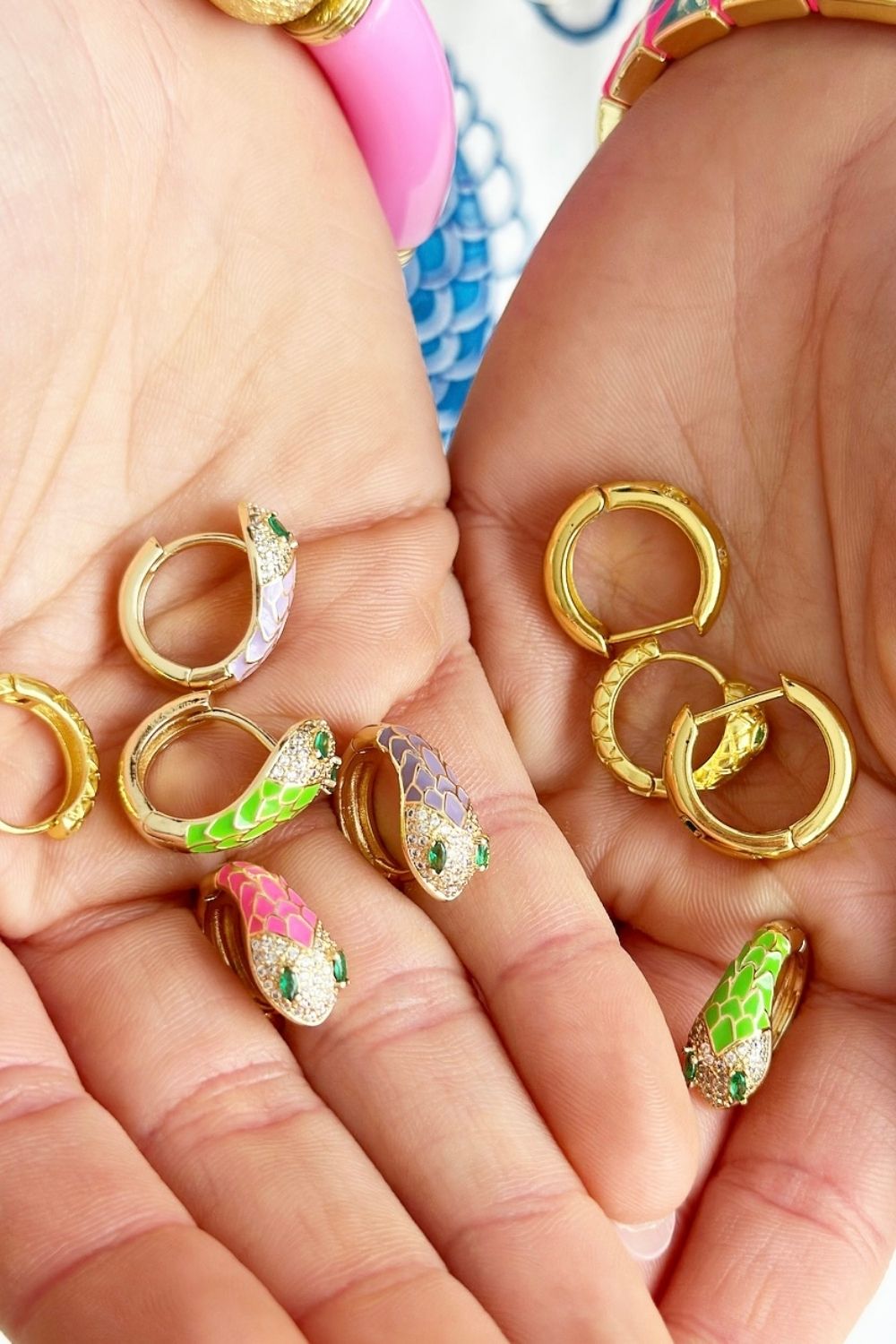 Slither into style with these stunning Gold Snake Hoop Earrings! Featuring a sleek snake design with intricate detailing and sparkling green eyes, these earrings are perfect for adding a touch of exotic elegance to any outfit.