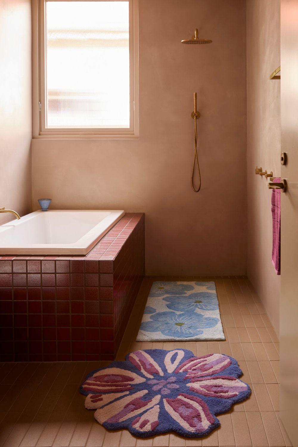 Sculptural florals in blue bring a modern garden feel to the bathroom. This long cotton bath mat is perfect for larger spaces.