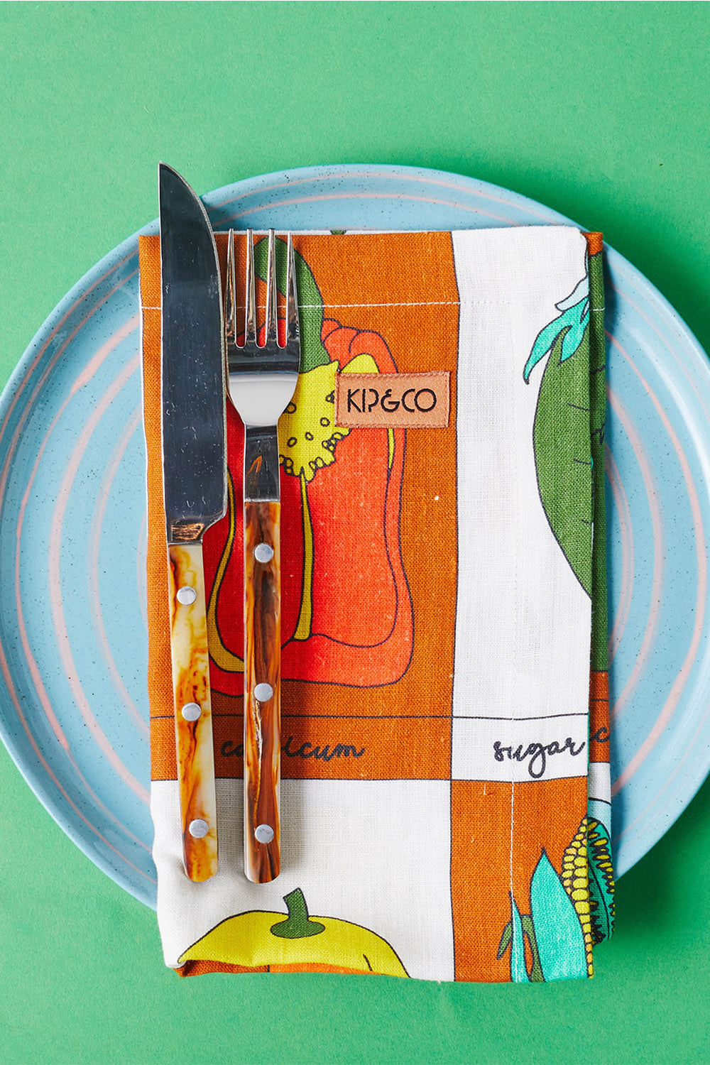 Add flair to your table setting styling with our statement linen napkin sets. Our printed linen napkins really pop! The Vegie Box Linen 4P Napkin Set features an illustrated vegie selection in muted autumnal tones with primary pops on a checkered brown and white base. Pair with a set of napkin rings and mix and match with our linen tablecloths and expansive range of serveware to style up a tablescape storm!