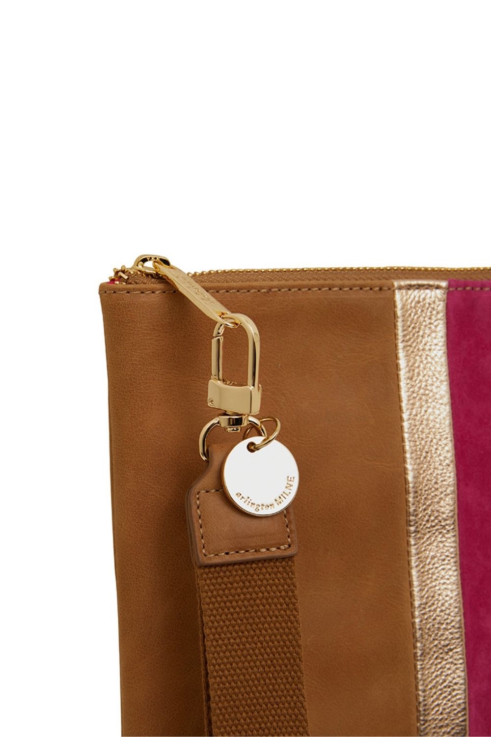 Paige Clutch - Stripe The Arlington Milne Paige Clutch is crafted from premium leather or suede. The clutch features a two - tone centre stripe detail, light gold hardware, an embossed logo, and a detachable wristlet .