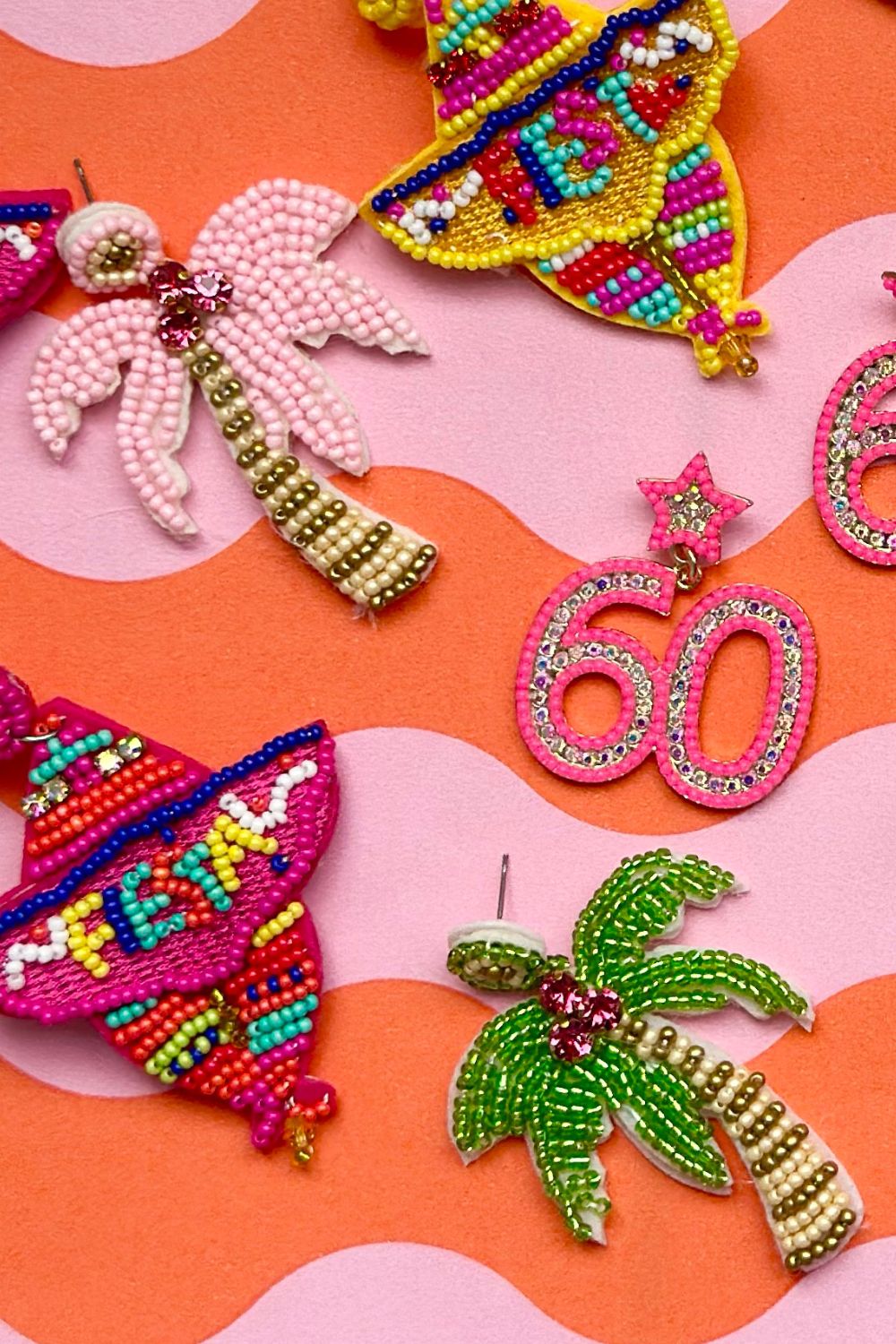 Escape to a tropical paradise with these whimsical palm tree earrings. Beaded in vibrant green and accented with golden trunks, these earrings capture the essence of a beach getaway. The delicate pink floral embellishment at the top adds a hint of charm, making them perfect for summer outfits or tropical vacations.