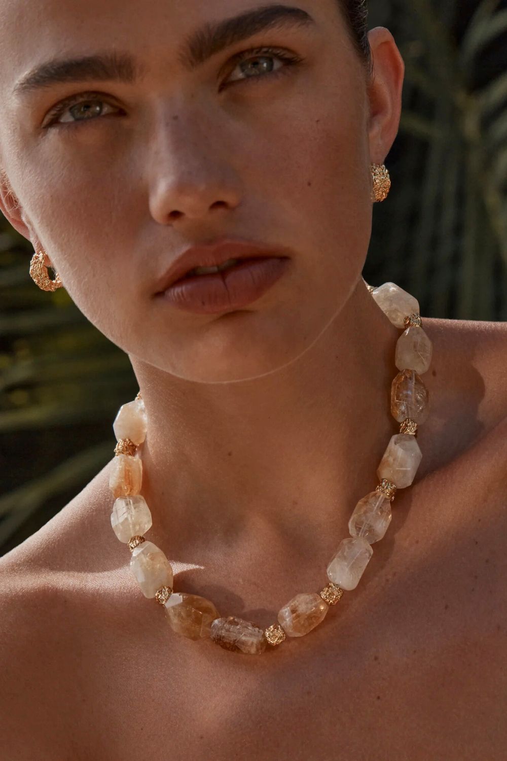 The Petunia Necklace boasts natural citrine quartz and textured gold pendants. This new neutral will be your go to piece. Handcrafted in Italy.
