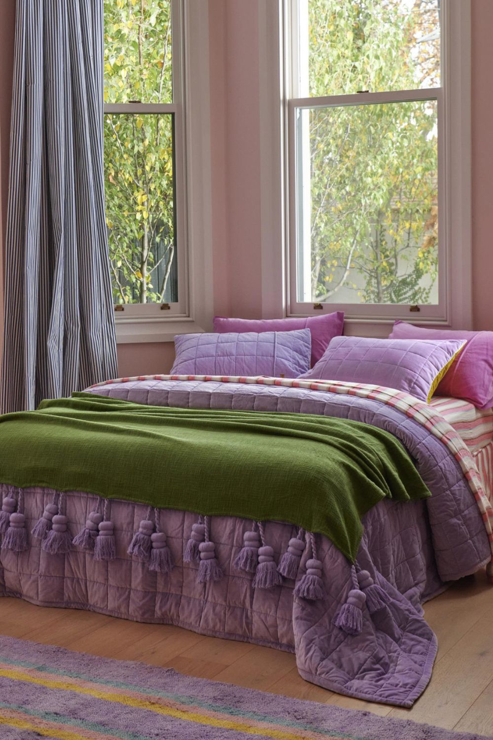 Beat the winter blues snuggled up in the cosy comfort of our Green With Envy Tassel Throw. Made with a textural natural woven cotton, this weighty throw is a solid green with feature lilac purple chunky tassels - a true Kip&Co signature. Whether draped over your sofa, layered on your bed, or wrapped around you as you sip a hot choccie, this blanket is the ultimate winter accessory for making your house well and truly feel like home.