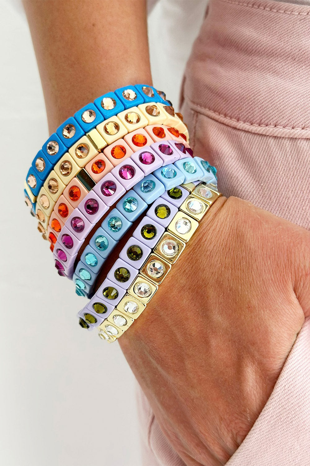 To rock the new Mosk Melbourne Siren bracelet, wear it solo to give a sleek, elegant vibe—letting those cut gemstones truly shine. Or, if you're feeling bold, chunk them up for extra fun and flavour. Made with features cut gemstones encased in enamel plating.