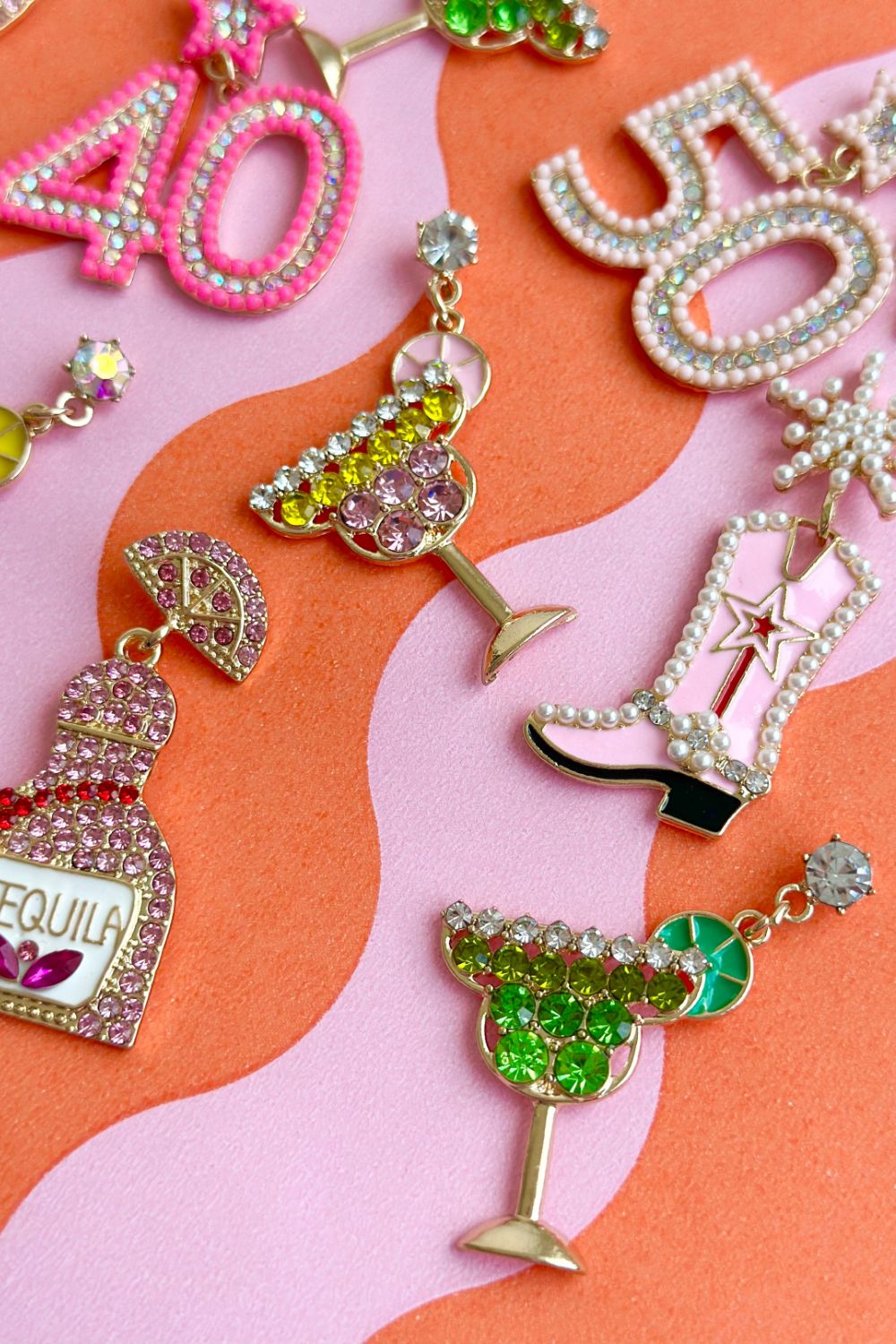 Cheers to these fun and fabulous tequila bottle earrings! Adorned with pink crystals and a bold "Tequila" label, they’re the perfect addition to your party-ready look. Whether it's for a night out or a girls’ brunch, these earrings are sure to get the conversation (and the drinks) flowing.