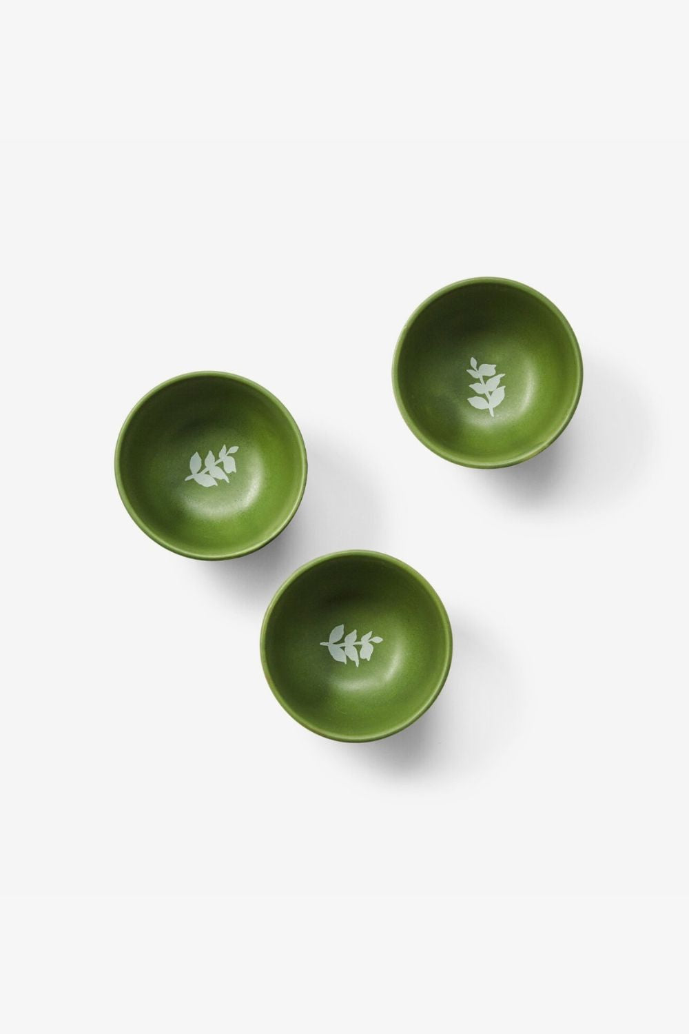 Set of three ceramic bowls with green vine motif. Perfect for condiments, nibbles, or adding colour to the table.