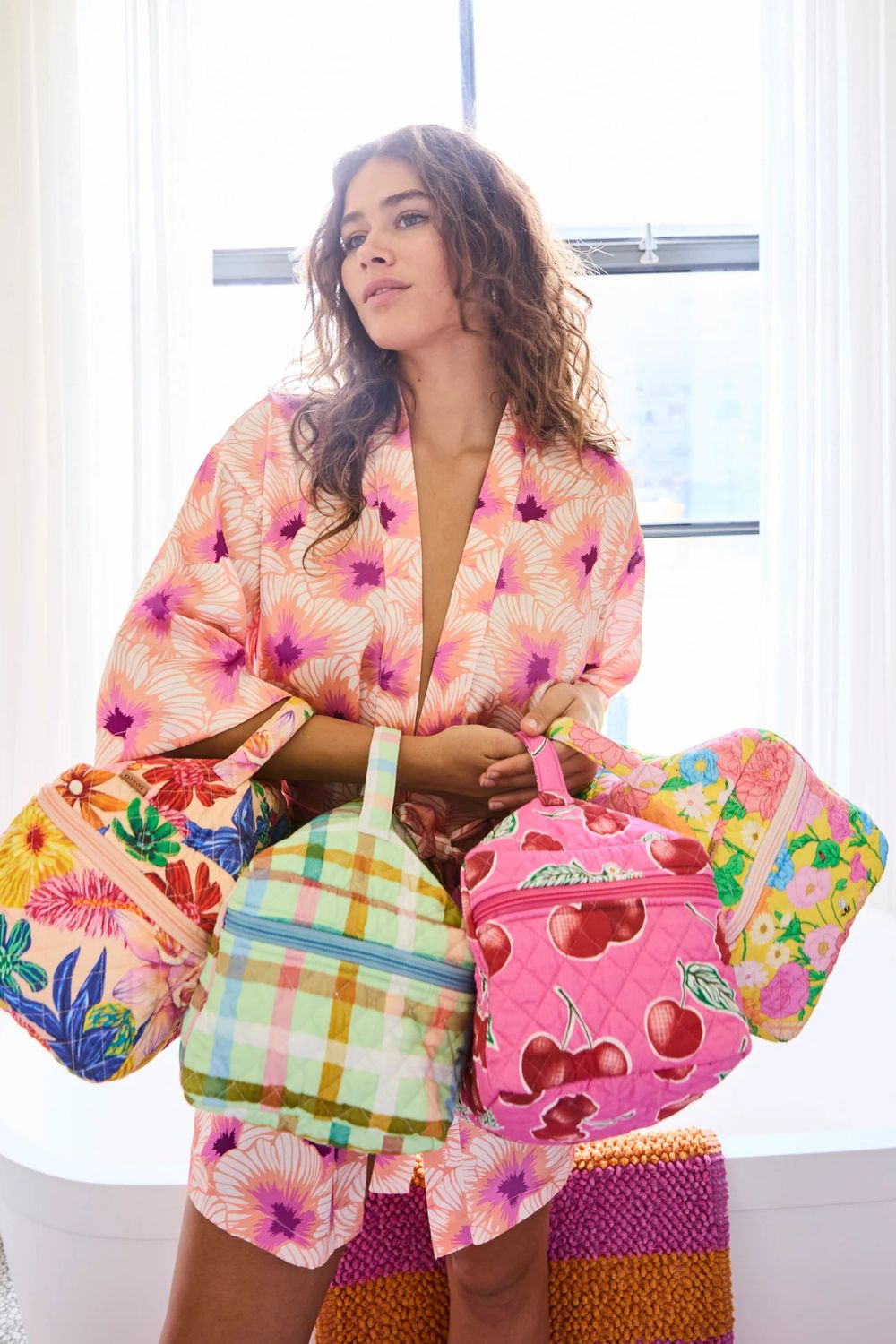 Our Candy Check Mint Quilted Cotton Toiletry Case is roomy, soft, and ready for all your travel treasures. With a zip closure to keep everything secure and a handy handle for easy toting, this softshell beauty is made for packing, squeezing, and stashing with ease. With plenty of space, it’s perfect for holiday hauls, weekend escapes, or simply keeping your bathroom bits in one happy home. The printed quilted cotton adds that cushy Kip&Co touch - practical, playful, and packed with colour. Featuring a pastel rainbow check on a pale minty green base with matching blue zipper.