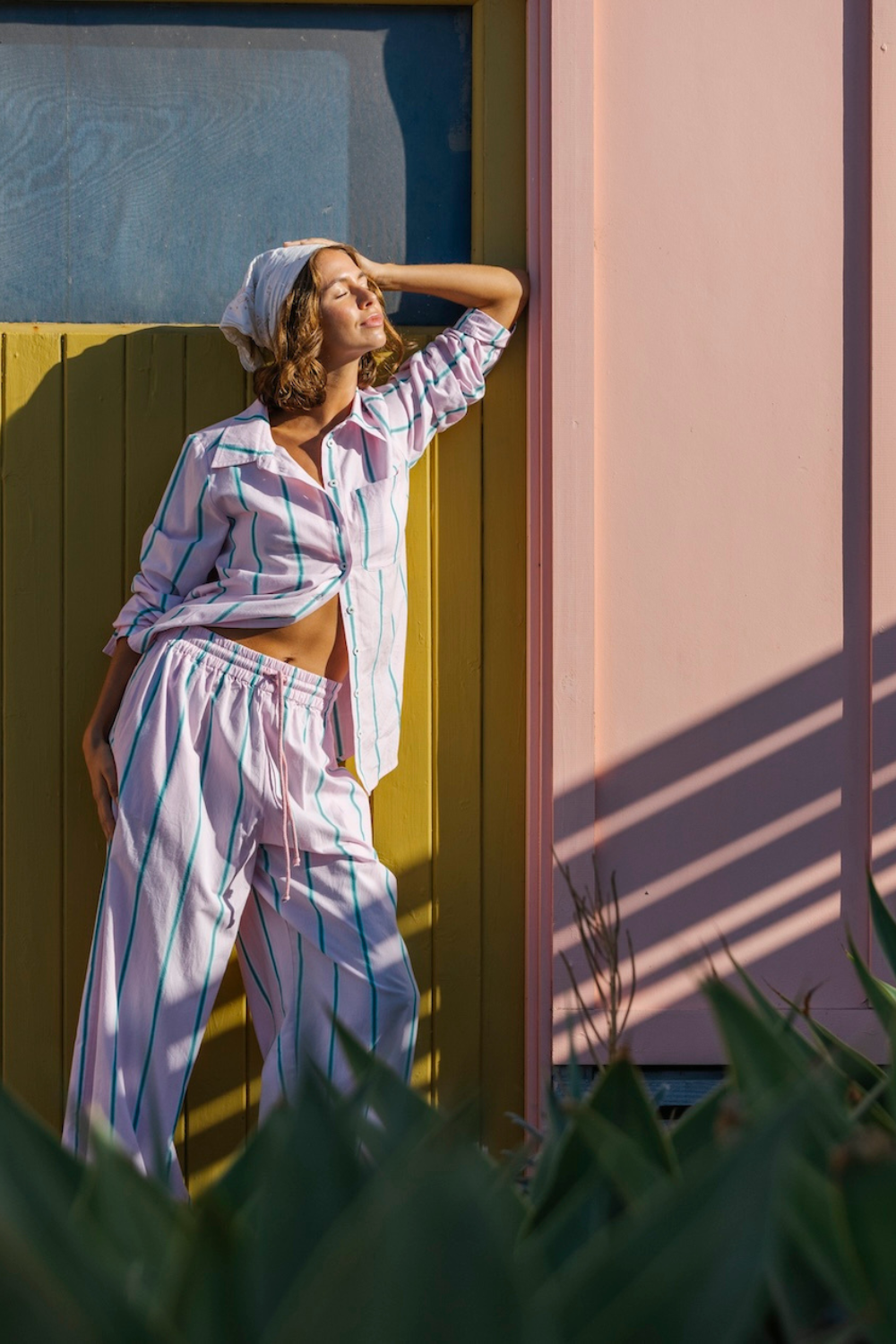 Yarndye cotton stripe in baby pink, white & green with a embroidered baby prawn friend on the pocket. It’s your not-so-basic button-up. Set & Forget how cool you look in our OFFSHORE matching pant.
