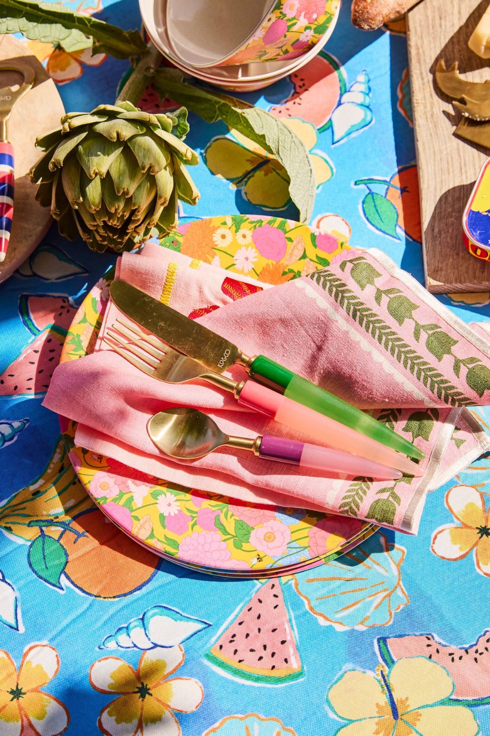 The Flower Chain Embroidered Napkin Set is made from a lush linen-cotton blend, with each napkin featuring a sweet green tulip flower border and white embroidered edge on a soft pink base. Ideal for casual lunches, brunches, or styled dinner tables, these napkins bring playful elegance and thoughtful detail to every setting.