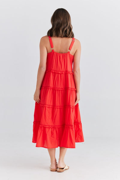 Midi dress with adjustable straps, elasticated back neck, tiered skirt with frills