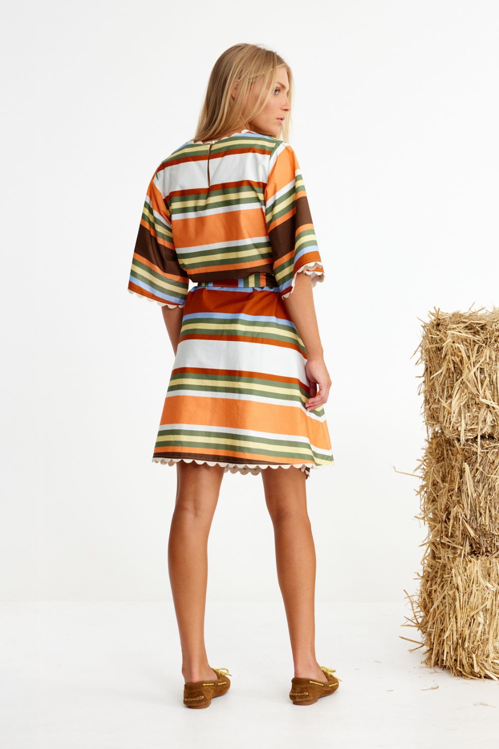 OATS. Served in bold, sun-baked stripes. One of our best sellers is back better than ever. Crispiest 100% cotton poplin, this knee-length dress is trimmed with ye olde Binny favourite ric rac. Whether you’re trackside with a tote of picnic provisions or strolling to beachside brunch this Aussie summer, it’s the perfect mix of comfort, colour, swagger.