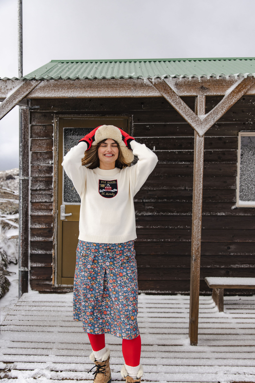 A classic cotton snow white crew knit with a wink. Piz Nair refers to several mountains in Switzerland, most famous of all St. Moritz. We love a European winter, the cable car, the apres, the charming timber lodges with adorable alpine details twinkling on a sunny day in the snow. It's just like the Sound of Music but winter jumper version. The perfect cotton transeasonal knitwear with a very cute embroidered badge. Booking the lodge in Falls.