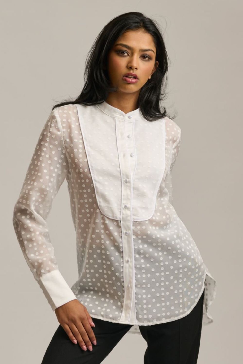 The Elle, is a stunner! A modern take on the classic dinner shirt. Crafted from spectacular sheer material with flocked velvet dots and subtle silk trims. A tuxedo front and fabulous cuffs with 5 feature silk covered buttons. A double thickness tuxedo front and fabulous cuffs finished with 5 feature silk buttons.