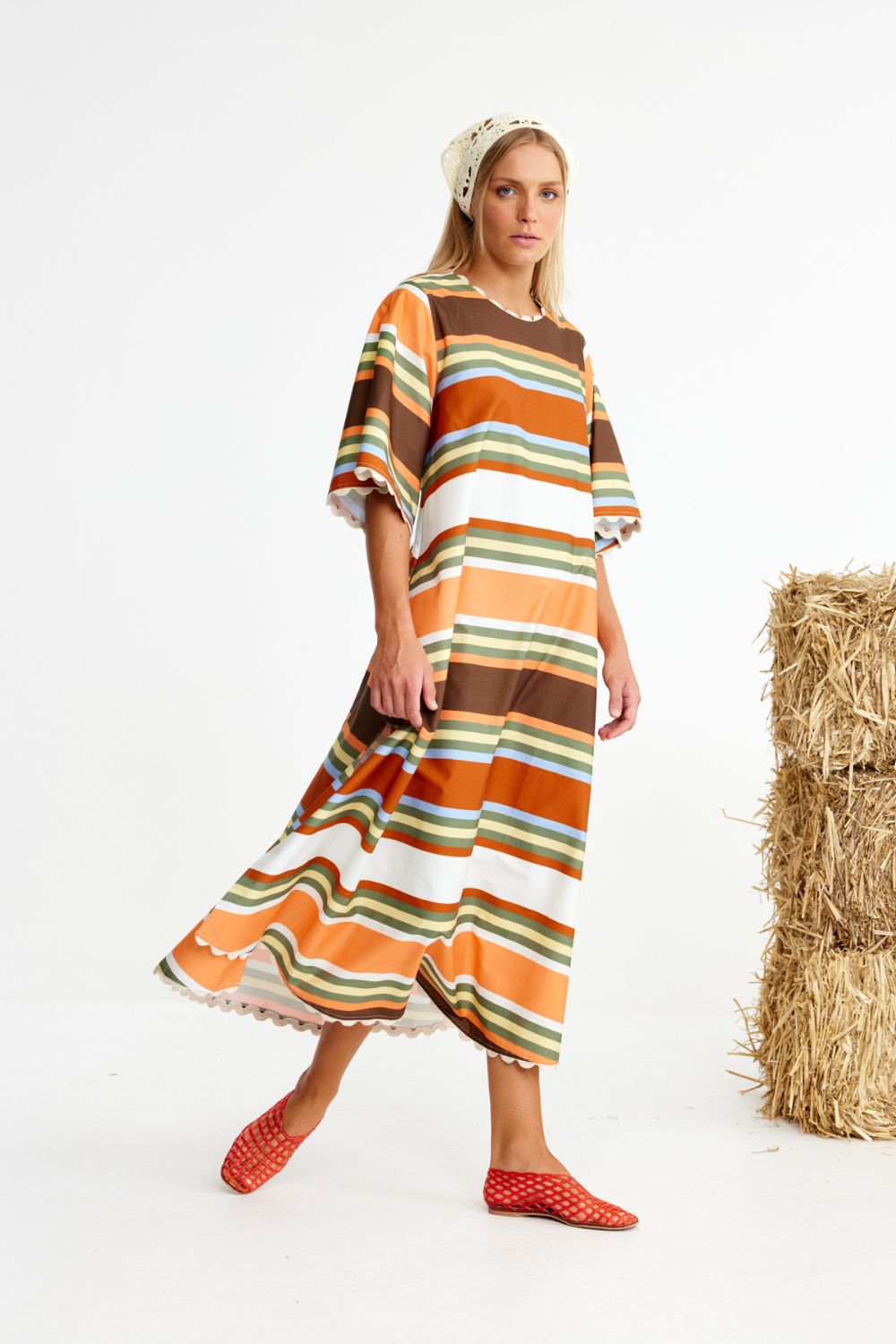THOROUGHBRED. Born to run.  Out the door. One of our best sellers is back better than ever. Crispiest 100% cotton poplin, this maxi shift dress combines bold, beachside stripes with ye olde Binny favourite ric rac trim. Side splits and pockets keep it practical, while the belt lets you pull yourself together. Into a more tailored silhouette. A guaranteed photo finish. Winner takes all.